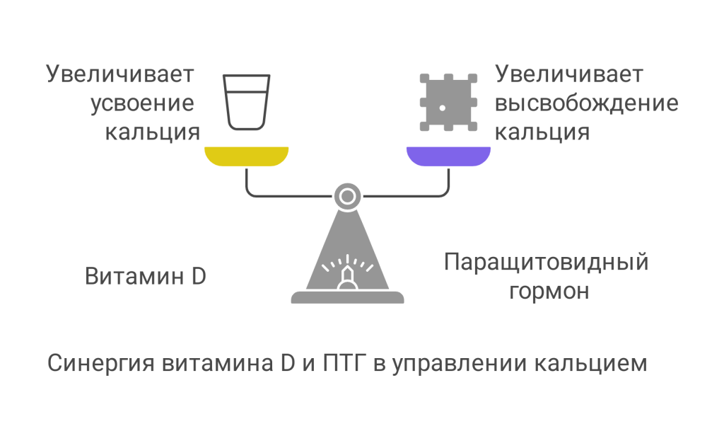 - Витамин D: увеличивает усвоение кальция в кишечнике и способствует его реабсорбции в почках.